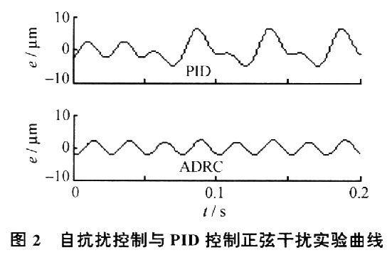 由图2可以看出,PID控制在加入干扰信号后,误差幅度明显增大,误差曲线规律也有明显改变。而自抗扰控制在加入干扰信号后,所受到的影响基本被消除,误差范围与未加入干扰前相当,说明自抗扰控制有良好的抗干扰特性,对于因切深变化而产生的交变切削力,抑扰能力要强于PID控制。