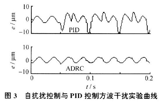 从图3可见,方波切削力干扰信号由于具有力突变的性质,所以对控制系统的影响要大于正、余弦干扰信号。对于自抗扰控制,在切削力发生突变时,误差仅发生小幅波动,对整体的误差范围没有影响。但对于PID控制,这种干扰所带来的误差波动是相当剧烈的。因此,对于因凹槽等原因而产生的方波规律变化的切削力,自抗扰控制的抑扰能力也强于PID控制。