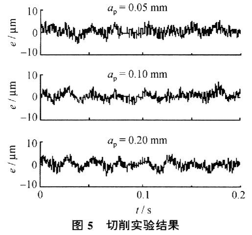 上述各种切削试验中刀具跟踪运动误差控制在5μm以内。图5给出了主轴转速1 200 r/min,进给量0.05 mm/r,切深分别为0.05、0.1和0.2mm时刀具跟踪运动误差。在实验过程中发现,跟踪误差随切削深度的增加而略有增加,但所加工活塞的椭圆度对误差范围的影响很小,因此,在加工大椭圆度活塞时将获得很好的相对误差值。
