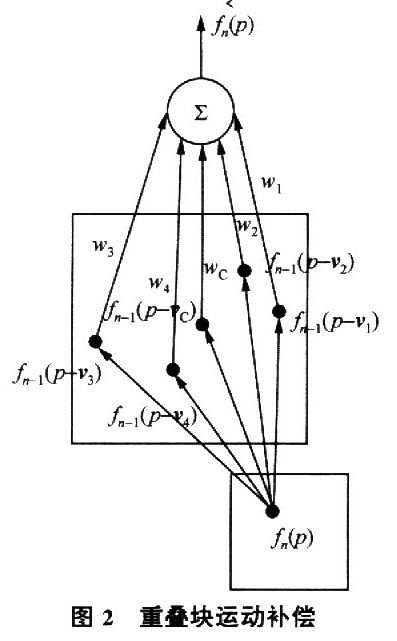 在高压缩效率下,基于块运动预测和补偿(block motion compensation,BMC)的视频压缩算法会产生块效应,严重影响了重建视频的主观质量。在H.264中,在运动预测/补偿环路中引入去除块效应滤波器以降低块效应的影响。另一方面,文证明了重叠块运动补偿(overlapped blockmotion compensation,OBMC)也是降低块效应、提高预测精度的一种有效手段,并研究了最优重叠块匹配加权窗的系数设计方法。但以上算法尚未在重叠块运动补偿中有效利用H.264现有编码框架中的多种预测模式,在H.264框架中引入重叠块运动补偿,可以进一步提高其编码效率。