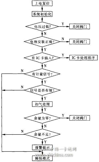 软件设计紧密结合IC卡智能燃气表的控制模式,充分体现了对Ic卡信息读写、卡类型判断、计量信号判断与数据处理、电压监测与电源保护等功能,并在信号安全性、软件运行可靠性及抗干扰等方面进行了精心设计。主程序流程见图2。
