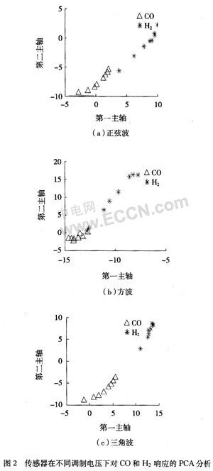 图1(a),(b),(c)分别是传感器在正弦波、占空比为40%的方波以及三角波调制下对5×10-4单一CO和5×10-4单一H2的响应曲线,其中加热电压周期都为30 s,幅值为1 V。对这三种响应信号进行主成分分析(PCA),结果如图2所示。可见,在正弦波或三角波电压的调制加热下,传感器对CO和H2的响应曲线更易于区分。