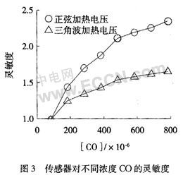 图3给出了传感器分别在正弦电压和三角波电压的调制下,对不同浓度CO的响应灵敏度。此处,灵敏度的定义为