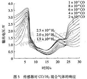 金属氧化物气体传感器的选择性通常较差,具体来说,基于SnO2的CO传感器对H2,CH4等多种还原性或易燃性气体的交叉响应非常明显。针对这个问题,目前常用的方法是对传感器进行温度调制。在这种工作方式下,传感器对不同的气体呈现不同的响应特性,利用模式识别技术对响应信号进行处理就有可能对被测气体的类别和浓度给出判定。Haifeng Ge等人对单个气体传感器进行温度调制,利用支持向量机算法实现了对H2,CO及其混合气体的定性识别,但是没有给出定量分析的结果;太惠玲等人利用4个SnO2气体传感器构成的阵列实现了对CO和H2混合气体的定量分析。