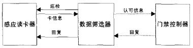 数据筛选器如同门禁控制器一样,一般工作在巡检模式下,它不断向感应读卡器发送巡检数据,并且等待获取感应卡内码数据。在这个过程中,感应读卡器已经完全和门禁控制器分离,门禁控制器对它的巡检命令完全由数据筛选器完成。只有当数据筛选器获取到卡信息并通过自身验证之后,才将数据送到门禁控制器。建立起感应读卡器和门禁控制器的联系。数据筛选器进行自身验证的数据源是经可靠途径获取的卡片内码数据。“后门卡”的内码不可能被传递到数据筛选器中,从而阻止了“后门卡”的攻击。