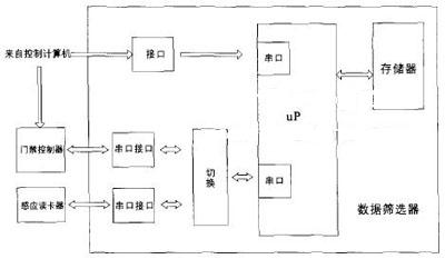 我们设计一个称为数据筛选器的设备,该设备串行安装在数据通讯的通道上,对所有刷卡的内码先行经过该设备的比对,对认可的数据,将卡片内码数据发送到门禁控制器进行后续操作;对不被认可的数据,直接将数据丢弃;这就使得那些“后门卡” 的数据根本无法发送到门禁控制器,从而从根本上截断了“后门卡”信息的通路。以下就是数据筛选器的工作框图。