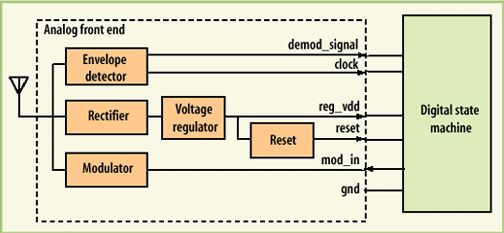UHF RFID标签模拟前端包括了几个内部模拟子模块。该模拟前端实现了DC电源、接收信号检测/解调制和发送调制等全部的模拟处理。图1中的模块图表示了典型 UHF RFID标签的模拟前端以及数字状态机。