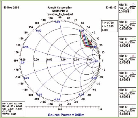 图4是标签前端的输入阻抗图。其采用Nexxim的谐波平衡引擎在拉源阻抗的大信号条件下进行仿真。功率转换到标签电路的最佳源阻抗在900MHz是Zs=35+j155Ω,当实现天线设计时,Zs还是理想的输入阻抗。采用达到Zs输入阻抗的目标来实现优化,以便可以从源(或天线)传输最大的功率。最终的设计如图5所示,其在整个UHF RFID频段内平坦的阻抗响应下产生了Za=34.3+j155Ω的输入阻抗。其还拥有1.95dB增益的宽全方向图。