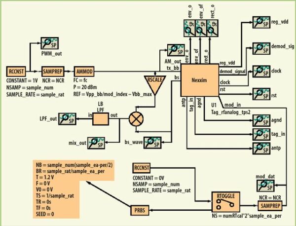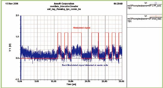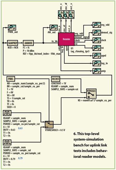 在全部必要的电路和天线设计之后,要花时间将所有模块放入系统仿真器中来实现通信链路分析。在Ansoft Designer中实现了两个分离的系统平台来完成链路测试。阅读器到标签(例如上行链路)和标签到阅读器(例如下行链路)测试平台如图6所示。在两个实例中阅读器都采用行为模型来实现。对于标签到阅读器的测试,也包括了在阅读器一侧的行为级PSK解调器,来恢复PSK反向散射调制信号。