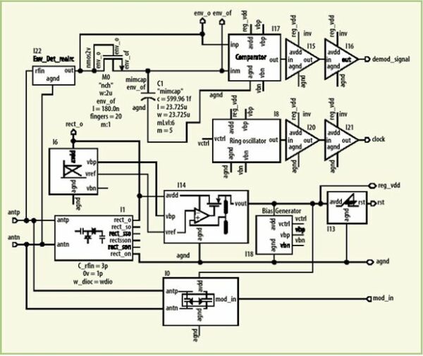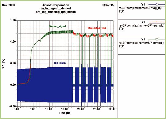 本文提出了基于商用0.18μm CMOS工艺的EPC Global Class-1 Generation-2 UHF RFID标签电路设计。采用标准晶圆厂库器件和已建立的IC设计流程阐明了标签模拟前端的设计和仿真,该模拟前端包括了整流器、电压调节器、复位、解调器和调制器电路等。采用Nexxim来实现额外的谐波平衡和源拉仿真。文中所示的天线设计提供了与整流器输入阻抗的共轭匹配。为了将所有这些方面组合在一起,顶层验证组合了行为模型、HFSS天线系统模型以及Nexxim瞬态仿真。这样,表明了该设计为上行链路和下行链路都提供了可靠的DC电源和解调后的信号(见图10)。