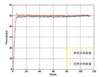 图5是有无积分初始值时响应曲线的对比。此图中,采样时间为1s,采样点数115个。从图可得,有积分初始值的响应进入稳态的时间明显短于无积分初始值。