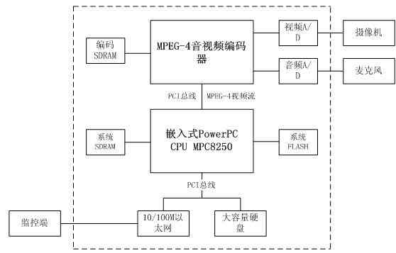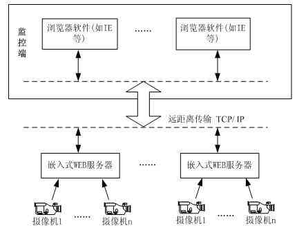 本系统由摄像机、嵌入式WEB服务器、传输网络和监控端组成。摄像机用来采集监控现场的视频。嵌入式WEB服务器是整个监控系统的核心,有硬件和软件两个部分,详细结