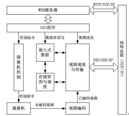 服务器的应用软件结构如图3所示。其主要由WEB服务器、CGI程序、嵌入式数据库mSQL、视频调度与传输模块、存储管理与调度模块、摄像机控制模块等几个重要部分组成。
