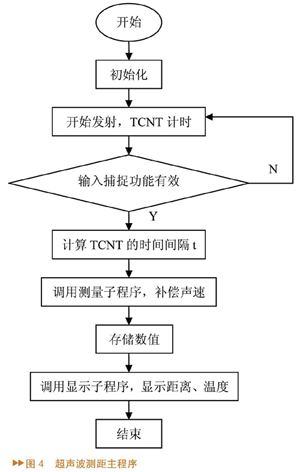 系统软件包括主程序、温度采集子程序、定时器计时子程序、计算子程序、液晶显示子程序等。主程序包括初始化和各个子程序的调用,最后把测量结果用液晶显示屏显示出来(见图4)。