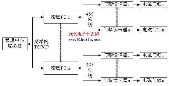 系统采用分层次分布式集中控制方案,将所有门禁读卡器组成一个分布式网络,其组成如图1所示。整个系统包括管理中心服务器、楼层PC、门禁读卡器三个层次结构。