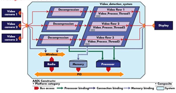 AADL的一个强大特征是能够针对目标系统同时对硬件和软件建模,这有助于工程师规定和评估完整系统的交互效应。在本例中,视频摄像机、无线收发器和处理器的选择将直接影响端到端的延时。