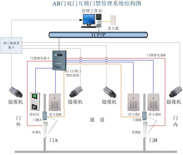 首先解释一下AB门双门互锁的概念,所谓双门互锁联动是指AB两道门具有互锁联动的功能,即当一道门被打开时,另一道门将打不开,只有当两道门都关上时,才能打开其中的任一道门。在高安全场所通道门禁应用中,特定人员进入第一道门后必须要按照操作要求锁好第一道门才能进入第二道门,如进入第一道门后没按要求关好此道门,将不能进入第二道门,这样做的目的是为了防止犯罪分子尾随作案。