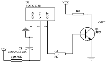 红外遥控接收采用一体化红外接收头,它将红外接收二极管、放大器、解调、整形等电路安装在一起,只有三个引脚。红外接收头的信号输出端接单片机的INT0端,单片机中断INT0在红外脉冲下降沿时产生中断。电路如图3.3所示,图中增加一只PNP三极管对输出信号放大,R和C组成去耦电路抑制电源干扰。