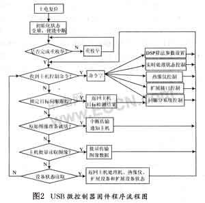 USB微控制器是实现USB通信的核心,同时也是系统的内部通信中心。USB微控制器不仅要负责实时信息处理机与主机USB通信,同时还要负责与伺服转台、热像仪、预留扩展接口等的通信。为了实现稳定闭环跟踪,实时信息处理机处理结果中包含的目标脱靶量必须以50 f/s的速率实时地传送给伺服转台,此传输不能受主控计算机与实时信息处理机USB通信的影响。由于windows操作系统本身多进程与USB传输的主从式工作原理,主控计算机之间的USB传输常被其他进程打断,导致USB传输速率下降,无法保证当前图像与目标信息以50 f/s的恒定速率实时传输给主控计算机显示。本系统中USB微控制器利用内部集成的强型805l内核通过对其可编程接口控制逻辑的合理设计和芯片内部F1FO的有效运用,根据本系统各种数据传输对时间、速率和可靠性的不同要求灵活运用控制传输、中断传输和批量传输,保证上述各种通信过程互不影响,有效地保证伺服转台的闭环跟踪性能。其固件程序流程图如图2所示。