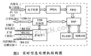 机的实时处理能力。由于本文设计的便携式红外目标自动检测与跟踪系统实时信息处理机的体积和功耗受到严格限制,在对各方面因素进行综合考虑的基础上,结合处理算法的动态可变和可重构特点,根据目标信息处理的基本流程设计了基于单片DSP+FPGA的实时信息处理机硬件平台,发挥DSP和FPGA各自的优势,合理划分处理任务,使得效率和灵活性得到充分提高。其结构框图如图3所示: