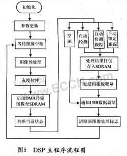 来自热像仪的14位差分数字图像经过电平转化,通过FPGA进行自适应偏置校正和增益校正拉伸处理后,缓存入FIFO中。当FIFO存满一帧图像时中断DSP,DSP将图像数据读入内部RAM空间进行处理。处理完成后,DSP将处理结果以及图像数据通过USB总线传送至主控计算机分系统。同时,通过扩展串口与伺服控制分系统、扩展上报接口、激光测距机及惯导陀螺仪接口等外部接口通信。