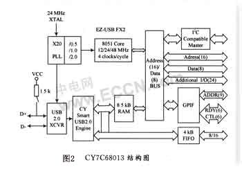 用于USB设备开发的芯片通常有2种类型:一种是MCU集成在芯片里面,如CYPRESS的EZ-USB;另一种是纯粹的USB接口芯片,仅处理USB通信,使用时必须由外部微控制器(MCU)进行控制,如Philips的PDIUSBD1 2,National Semiconductor的USBN9604等。在本设计中经过论证分析,采用第一种类型,采用Cypress公司的EZ-USB FX2系列的CY7C68013芯片。