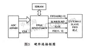 根据系统对数据传输的速度和实时性的要求,配置CY7C68013工作的接口模式为Slave FIFO模式。当进行数据采集时,硬件连接方式如图3所示。