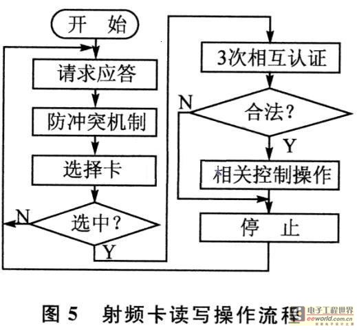 当射频卡进入读写器的天线感应范围(10 cm内)并经过一段时间的延迟,射频卡上电复位,接收MF RC531发送的请求应答指令,返回卡的类型号。当有多张卡同时接近读卡器时,MF RC531随即发送防冲突指令,系统进入防冲突循环中,选中一张卡,此时被选中的卡进入激活状态,随后卡与MF RC531之间进行3次相互认证,认证通过方可进行读、写、加、减等交易操作。操作完成后,MF RC531发出停卡指令,射频卡从激活状态返回停止状态,一次交易结束。在对卡内数据进行读写操作之前,需要进行从请求应答到相互认证的过程,如果这个过程器件出现错误,将导致读写操作无法进行。