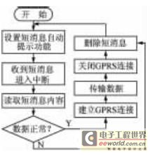 GPRS数据终端起着连接读写器设备与远程监控中心通信的作用,通过GPRS模块M33,远程监控主机可以随时了解读写器的状态。模块M33有两种状态,一种是短消息接收状态,另一种是自动监控状态。图6是M33处于短消息接收状态时GPRS数据传输的流程。