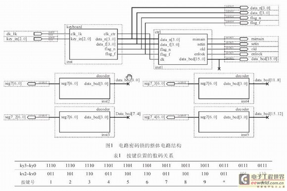 对于键盘译码电路,由于图2中的键盘按键分为数字按键和功能按键,每一个按键可负责不同的功能,而键盘所产生的输出(也就是扫描回复信号)却无法直接拿来用作密码锁控制电路的输入,所以必须由键盘译码电路来规划每个按键的输出形式,以便执行相应的动作。