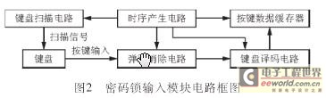 密码锁输入模块的电路框图如图2所示,它由时序产生电路、键盘扫描电路、弹跳消除电路、键盘译码电路和按键存储电路组成。