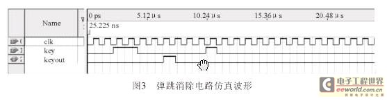 弹跳消除电路可避免误操作发生。由于设计中采用的矩阵式键盘是机械开关结构,因此,在开关切换的瞬间,会在接触点出现信号来回弹跳的现象。为使电子密码锁可靠工作,必须加上弹跳消除电路。弹跳消除电路采用软件延时的方法消除抖动,其仿真波形如图3所示。从图3中可以看出,若采样信号连续两次或超过两次检测到高电平信号,说明按键状态确实发生了变化,此时电路输出一个时钟周期的按键信号;否则当作抖动处理而不予理会,以此来消除抖动。