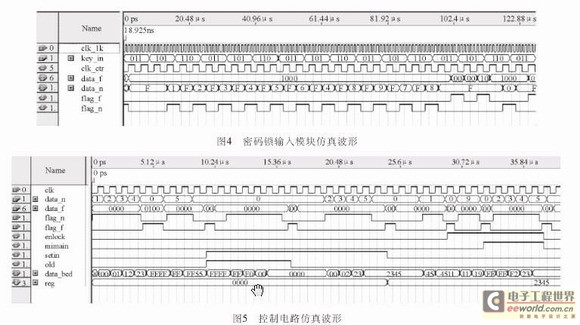 图4所示是密码锁输入模块的仿真波形,图中,数字键数据“0、1、2、3、4、5、6、7、8、9”和功能键数据“0100、0001”所得到的输出不同,由此可证明密码锁输入模块的正确性。