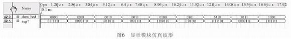 本电子密码锁的显示模块比较简单,其作用是将控制模块的BCD码输出转换为7段显示编码,然后驱动数码管,其仿真波形如图6所示。