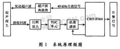 从低通滤波器输出的信号送入MCU,单片机将此模拟信号经A/D转换后进行分析处理,如有障碍物的回波信息则发送报警信号。