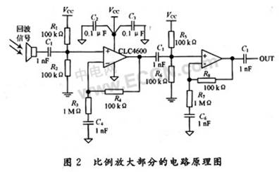 信号发送出去以后若遇障碍物就会反射回来,即为回波。回波信号信号一般较弱,仅为几毫伏,该系统先将接收到的回波进行比例放大,使回波信号增大到几百毫伏。比例放大部分采用的芯片是CADEKA Microcircuits的CLC4600运算放大器,CLC4600运算放大器据具有四信道,每通道供电电流消耗仅3.3 mA,具有300 MHz的单位增益带宽。比例放大部分的电路原理图如图2所示。