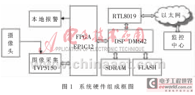 由于该系统处理的数据量较大,且要求实时性强,故采用DSP和FPGA相结合的方法,加上图像数据采集芯片以及存储芯片,构成核心图像处理单元。同时配备有本地报警模块、网络传输等,从而构成了一个完整的监控系统。系统组成框图如图1所示。与原有系统相比,本系统作了如下改进:把原来只作为数据缓冲处理的FPGA设计为主控芯片,控制数据的输入调理和输出报警,而把DSP解放出来,专门用作图像处理及传输。这样可以提高数据的处理速度,从而提高系统的反应速度。