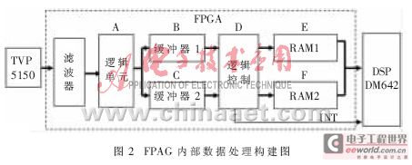 (3)FPGA负责实现系统的逻辑、输出控制以及内部缓存的时序控制。为实现图像的实时采集和处理,需要视频采集和图像处理并行工作。采集到的图像数据送到DSP前的缓存接口设计是关键,设计的优劣直接影响到系统的反应速度。要提高数据缓存读取速度,可利用FPGA内部资源构建高速双口RAM作为内部缓存,使数据帧处理交替进行,从而实现数据采集与处理同时进行,其内部结构如图2的虚线框内所示。采集到的数字视频信号先经过滤波处理,之后送入逻辑单元A,A负责产生时钟及数据逻辑控制。输入的视频数据信号在A的控制下,进入到缓冲器寄存器B和C,在控制单元D的控制下,送到双口RAM。为了实现实时图像采集和处理,使得FPGA对图像数据的缓冲和DSP对图像数据的读取同步进行,将RAM分成相等的2块,即RAM1和RAM2。在系统工作的过程中,一块用于缓冲图像数据,FPGA分类缓冲后的图像信号写入该存储区;另一块则由DSP用于对图像数据的读取,DSP可以直接对这个存储区的数据进行运算。该缓存结构的另一特点是FPGA和DSP对双口RAM的寻址是来回切换的。因为DSP读取RAM的速度大于FPGA写RAM的速度,所以切换信号仅由FPGA发出。当FPGA分类缓冲数据写满RAM1时,FPGA向DSP发出一个中断信号,此时DSP读取RAM1中的数据,同时FPGA的缓冲数据写入RAM2。当RAM2中数据写满时,FPGA再向DSP发出中断信号,DSP读取RAM2中的数据,同时FPGA的缓冲数据RAM1。如此交替实现图像数据读写同时进行,从而提高了数据处理的速度。