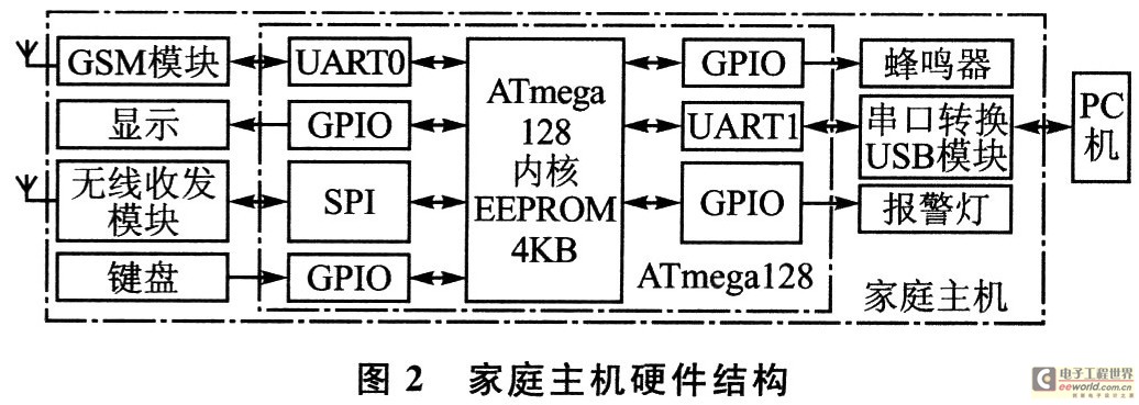 家庭主机是整个家庭智能防盗报警系统的核心,其自身既可以在收到报警信号后独立报警,驱走盗贼,还能发送报警短信到小区主机和地区主机,通知安防人员尽快到来。家庭主机硬件结构如图2所示。