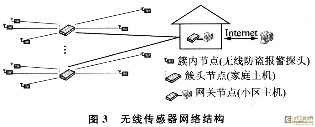 无线传感器网络是一种全新的信息获取平台,能够实时监测和采集网络分布区域内的各种监测对象的信息,并将这些信息发送到网关节点,以实现指定范围内的目标检测与跟踪,具有展开快速、抗毁性强等特点。区域家庭智能防盗报警系统利用了无线传感器网络原理布设了无线智能防盗报警网络,其中无线防盗报警探头为簇内节点,家庭主机为簇头节点,小区主机为网关节点。无线防盗报警探头的报警信息可以及时汇聚到小区主机,小区主机及时反映,使安防人员能够快速响应。无线传感器网络结构如图3所示。