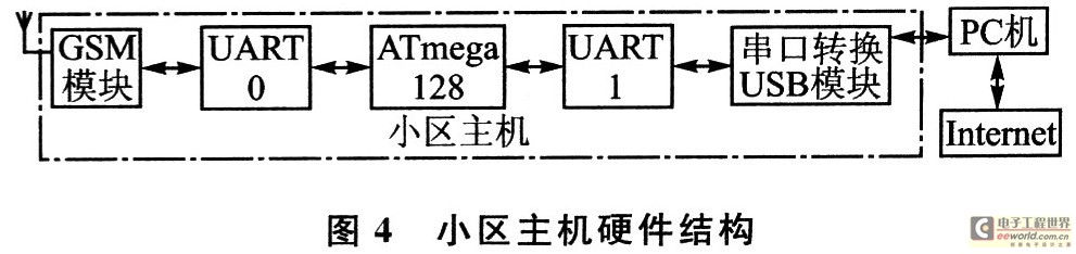 小区主机主要是进行居民小区内的用户管理,安防范围覆盖整个小区,适合于小区保安部门安装,对整个小区进行安全防护监管,小区主机硬件结构如图4所示。