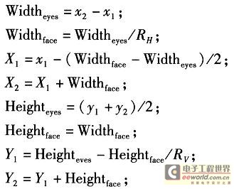 通过已获得的样本来判断人脸的位置,选取合适的人脸,截取出做样本是重要的步骤。人脸特征定位与特征提取质量的好坏对于人脸图像识别效果有直接的影响。首先确定人眼的坐标(x1,y1)和(x2,y2),由此可间接得到正方形人脸的左上顶点和右下顶点的坐标,设其分别为(X1,Y1)和(X2,Y2),其详细计算方法如下所示