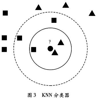 KNN的实现分训练和识别两步。训练时,把每类样本降维后的结果作为KNN的输入。K近邻算法将一个测试点x分类为与它最接近的K个近邻中出现最多的那个类别,从测试样本点开始生长,不断扩大区域,直到包含进K个训练样本点为止,并且把测试样本点的类别归为这最近K个训练样本点中出现频率最大的类别。如图3所示,圆圈表示待识别数据所处的位置,选择K值为3时,选中实线圆中的3个数据,识别结果为三角形代表的类;选择K值为5时,选中虚线圆中的5个数据,识别结果为正方形代表的类。所以选取恰当的K值对分类的结果有很大影响。如果K值选取过大时,可能能较正确地分类,但是同时牺牲了性能,提高了计算复杂度。如果K值选取过小,则大大降低了计算复杂度,但是可能会影响分类的准确性。