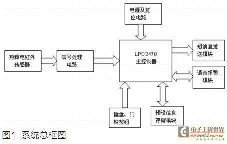 目前市场上出现的智能报警系统性能较为单一,价格昂贵,一些系统往往是在门窗被破坏的时候才发出警报通知主人或报警中心,且响应都需要一些时间,而时间越久就对家里的财物越危险。安防的最好方法则是当不法分子有入侵企图时就发出语音警报,增加其心理压力,迫使其自动离开,而且当这种方法失效时,还可以通过记录入侵时间,以发送短消息的方式通知主人或报警中心。本方案正是基于此思想,当有人体在门外活动时,热释电红外传感器探测到的信号经专用芯片处理后送给基于ARM7的主控制器 LPC2478,主控制器依据信号时间的长短发出一般提示或警告提示指令,同时警告信息会以短消息的形式发送到户主手机上,以便户主在第一时间报警。该方案智能化高、使用简单,不需要户主进行复杂的操作,十分适合一般家庭的使用。