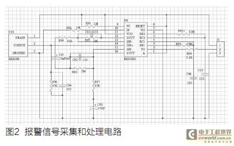 报警信号采集和处理模块主要由热释电红外传感器(PIR)RE200B和红外传感专用处理芯片BISS0001构成。热释电红外传感器利用热释电效应,以非接触形式检测出人体辐射的红外线,并将其转变为电压信号。在实际使用时在传感器前安装菲涅尔透镜,可将检测距离提高到10m以上。针对PIR信号变化缓慢、幅值小的特点,选用了BISS0001红外信号专用芯片,该芯片内部集成运算放大器、电压比较器、状态控制器、延时时间定时器和封锁时间定时器,完全满足红外信号处理需要。RE200B的D、G、S端分别为电源端、地端和目标输出电压端。BISS0001芯片的输出信号VO送至主控制器,供其读取,具体电路见图2。