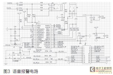 语音报警模块主要由NXP公司生产的一种支持IIS总线数据格式的音频编解码芯片UDA1341TS组成。IIS是SONY和NXP等公司共同推出的一种主要针对数字音频处理技术和设备的标准接口,它将音频数据和时钟信号分离,从而避免了由时钟带来的抖动问题,系统中不再需要消除抖动的器件。UDA1341TS的IIS总线接口信号线为:位时钟输入BCK、字选择输入WS、数据输入DATAI、数据输出DATAO和音频系统时钟SYSCLK信号线。主控制器LPC2478提供了IIS总线接口发送和接收共两组六根信号线,即IISRX_CLK、IISRX_WS、IISRX_SDA、IISTX_CLK、IISTX_WS、IISTX_SDA,具体电路见图3。