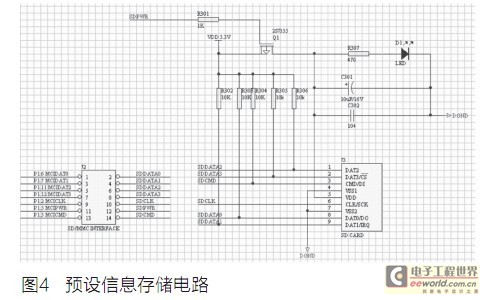 预设信息存储模块主要由SD卡构成。LPC2478提供了SD/MMC卡主机控制器,因此在设计SD/MMC卡接口电路时,只需将这些接口相应地接到SD/MMC卡座就可以了。SD/MMC接口电路见图4。SD卡有两种工作模式,即SD和SPI模式。在此设计中,我们选择SPI模式,SD卡的SPI通道由以下4个信号组成:CS(片选)、CLK(时钟)、DataIn(主机到卡的数据信号)和DataOut(卡到主机的数据信号)。CS是SD卡的片选信号线,在整个SPI操作过程中,必须保持低电平有效,CLK便于同步,DataIn不但传输数据,还发送命令,同样DataOut除了发送数据外还传送应答信号。SD卡中主要用来存储正常语音和报警语音信息以及预设的报警短消息。整个操作均由LPC2478来控制。