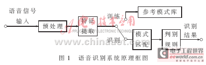 语音识别本质上是一种模式识别的过程,未知语音的模式与已知语音的参考模式逐一进行比较,最佳匹配的参考模式被作为识别结果。图1是基于模式匹配原理的自动语音识别系统原理框图。
