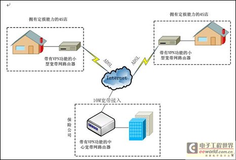 4S店通过ADSL加VPN的方式接入网络。这种方式不仅接入方便、成本低、而且VPN有效的防止了网络黑客的攻击以及非法用户的盗用,最大程度上保证了网络的安全。