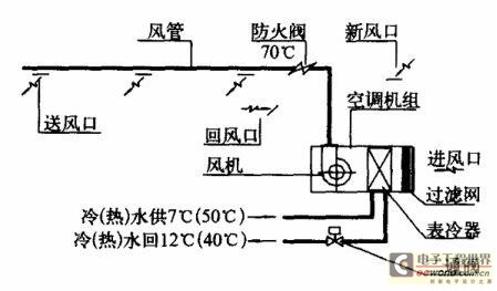 本课题中的暖通空调系统是把工程中常用的系统形式与我院智能建筑实验室的实际系统相结合,由全空气一次回风系统、风机盘管系统、风冷热泵机组系统和排风兼排烟系统4 个子系统组成,其中风冷热泵机组为一次回风系统,风机盘管系统提供冷热源;排风排烟系统平时用于换气,火灾时兼做排烟系统。本文着重介绍一次回风系统,其组成及原理见图1 。